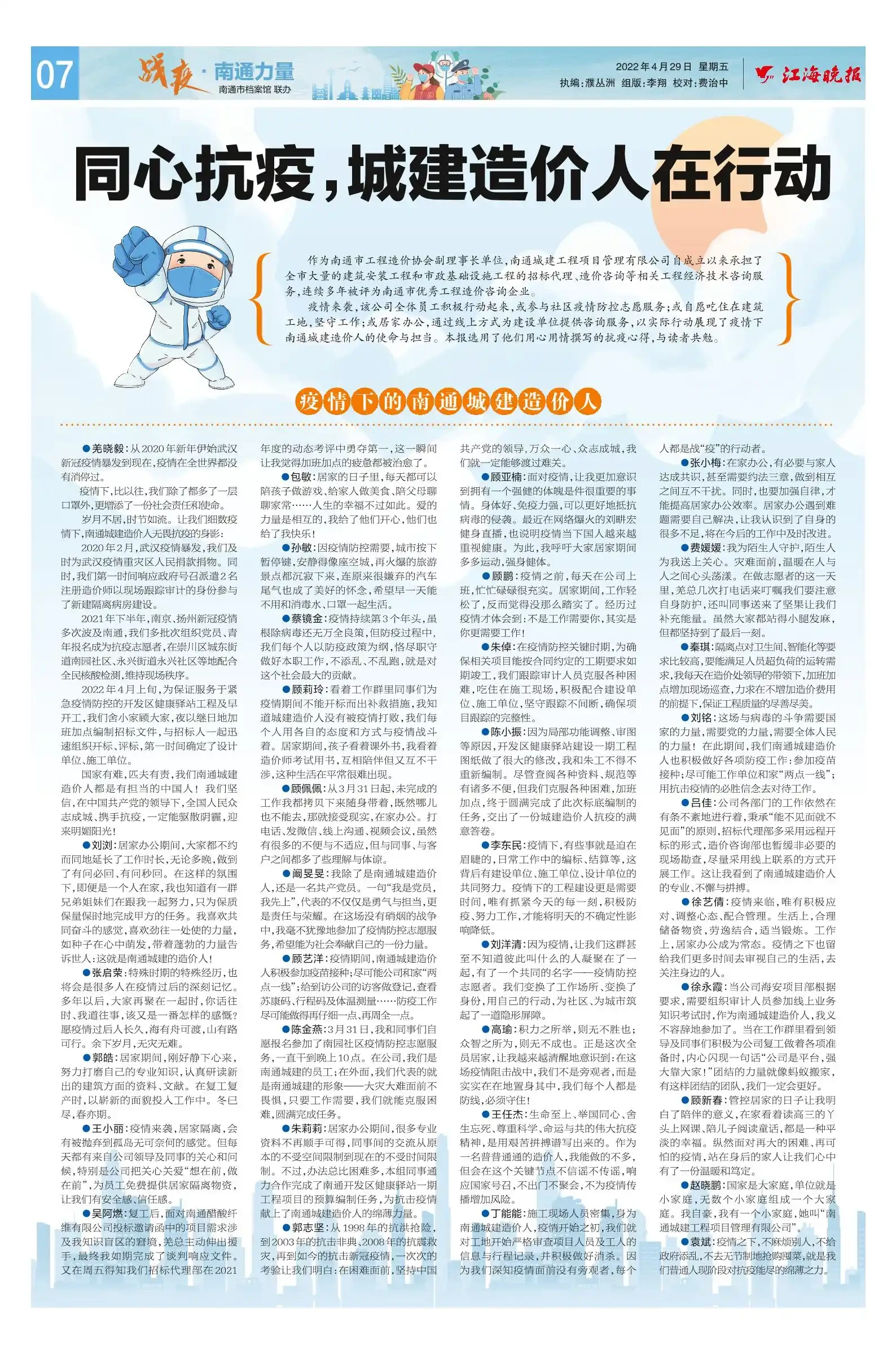 疫情来袭,该公司全体员工积极行动起来,或参与社区疫情防控志愿服务;或自愿吃住在建筑工地,坚守工作;或居家办公,通过线上方式为建设单位提供咨询服务,以实际行动展现了疫情下南通城建造价人的使命与担当。本报选用了他们用心用情撰写的抗疫心得,与读者共勉。